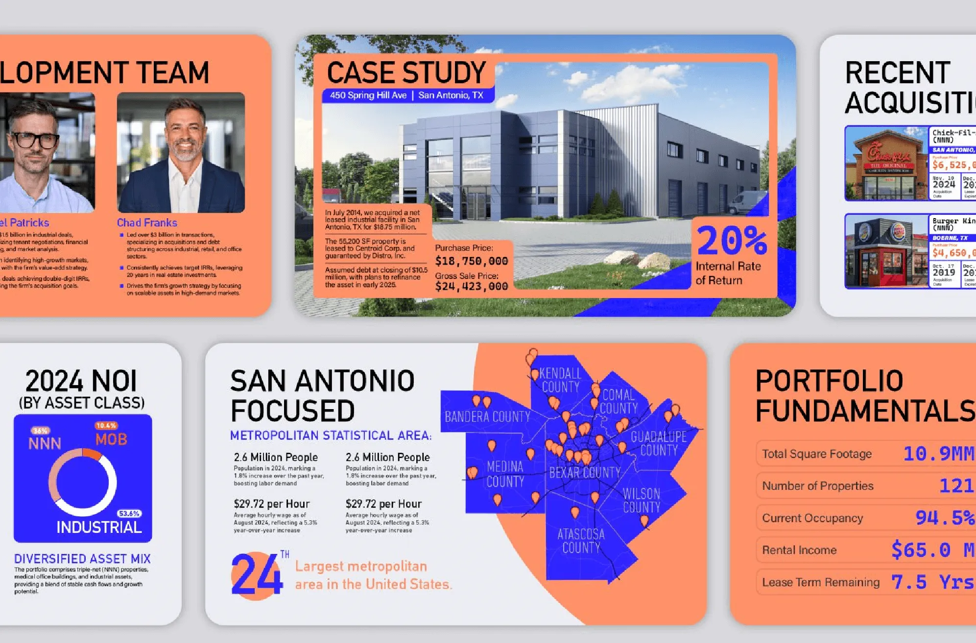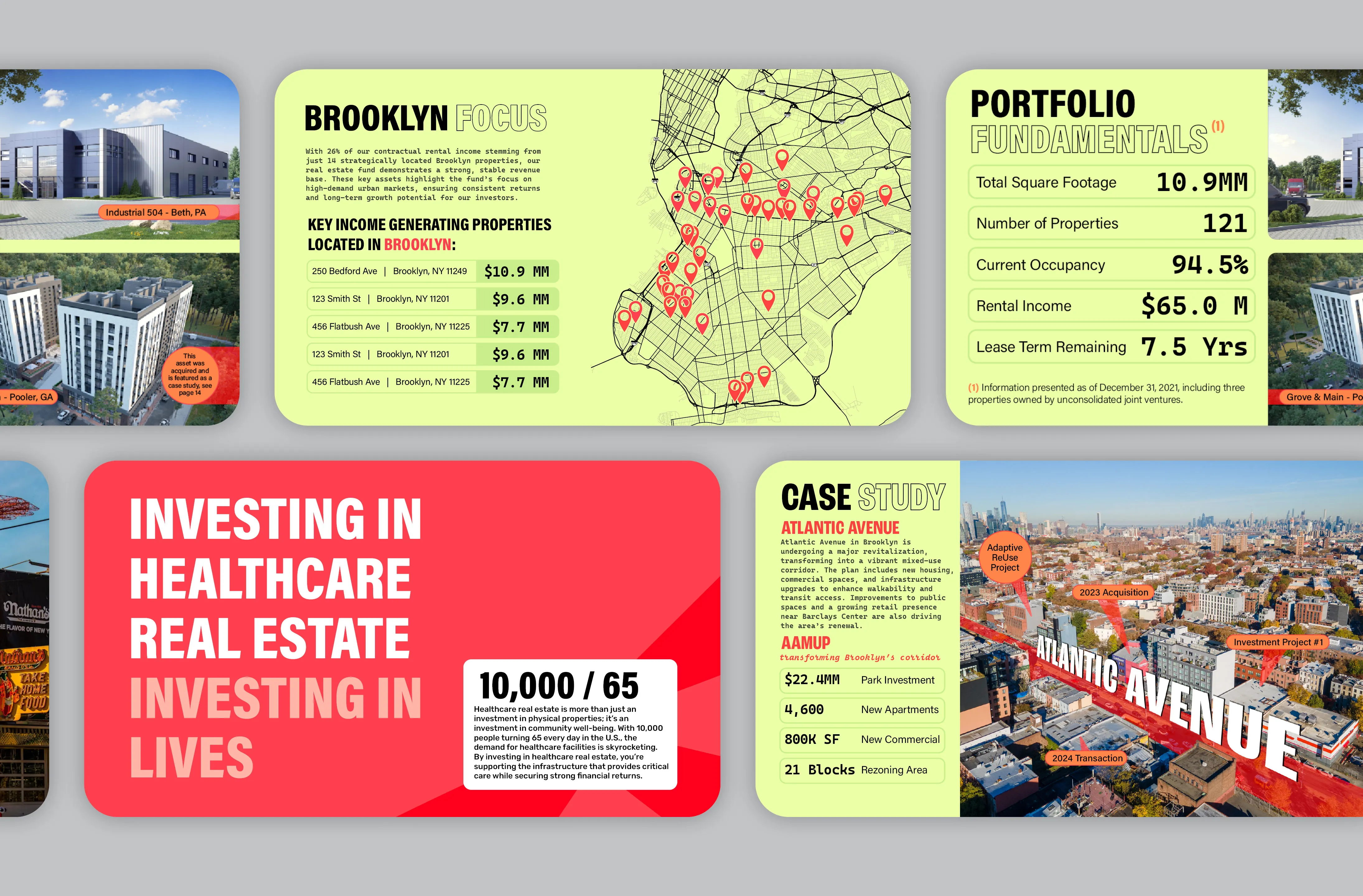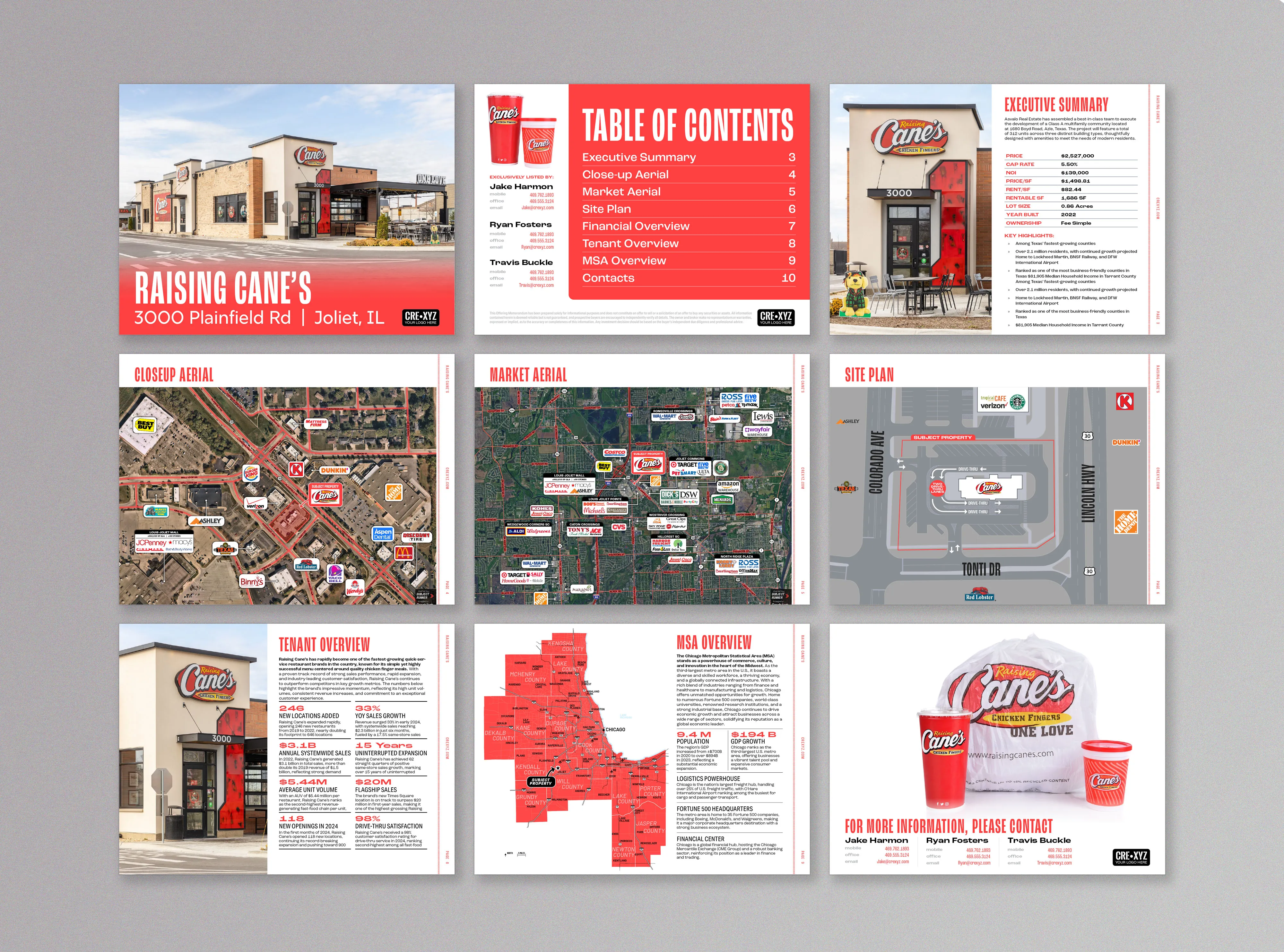 We deliver high-impact marketing materials for commercial real estate professionals—quickly, consistently, and without the hassle. From offering memorandums and pitch decks to aerial maps and renderings, we keep your projects on track and set the pace for success. Our designs are clean, clear, and purposeful, helping you present opportunities with confidence and stay ahead of the pack.